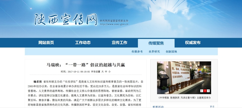 2017年8月,土耳其研究中心马瑞映教授应邀为社科联举办的大型公益讲座“长安讲坛”进行主题演讲。10月11日,《陕西日报》在理论版(第7版),以《“一带一路”倡议的超越与共赢》为题,对此次讲座的内容进行了专版刊登。同时,陕西宣传网于10月12日对文章进行了全文推介。