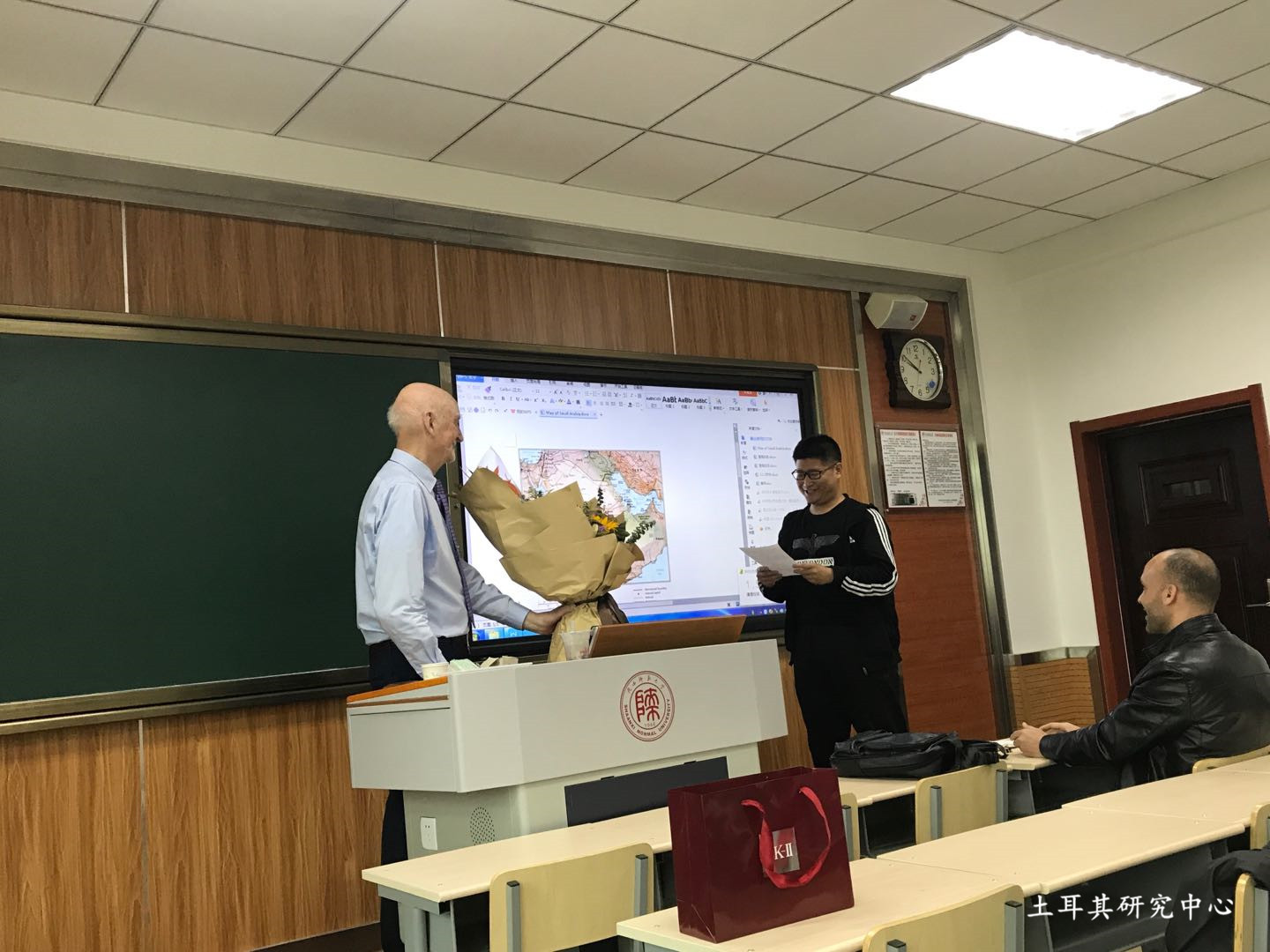 2018年4月13日,陕西师范大学历史文化学院中东史专题课程正式结业,结业仪式在文渊楼三段举行,李秉忠主任再次感谢蒂姆•尼布洛克教授历时四十多天以来的辛勤传授,使我院学子在中东史专题学习中备受启发。我院2017级世界史班向蒂姆教授献花表示敬意并诵读感谢信,感谢教授对其思想上的启发和科研上的助推。