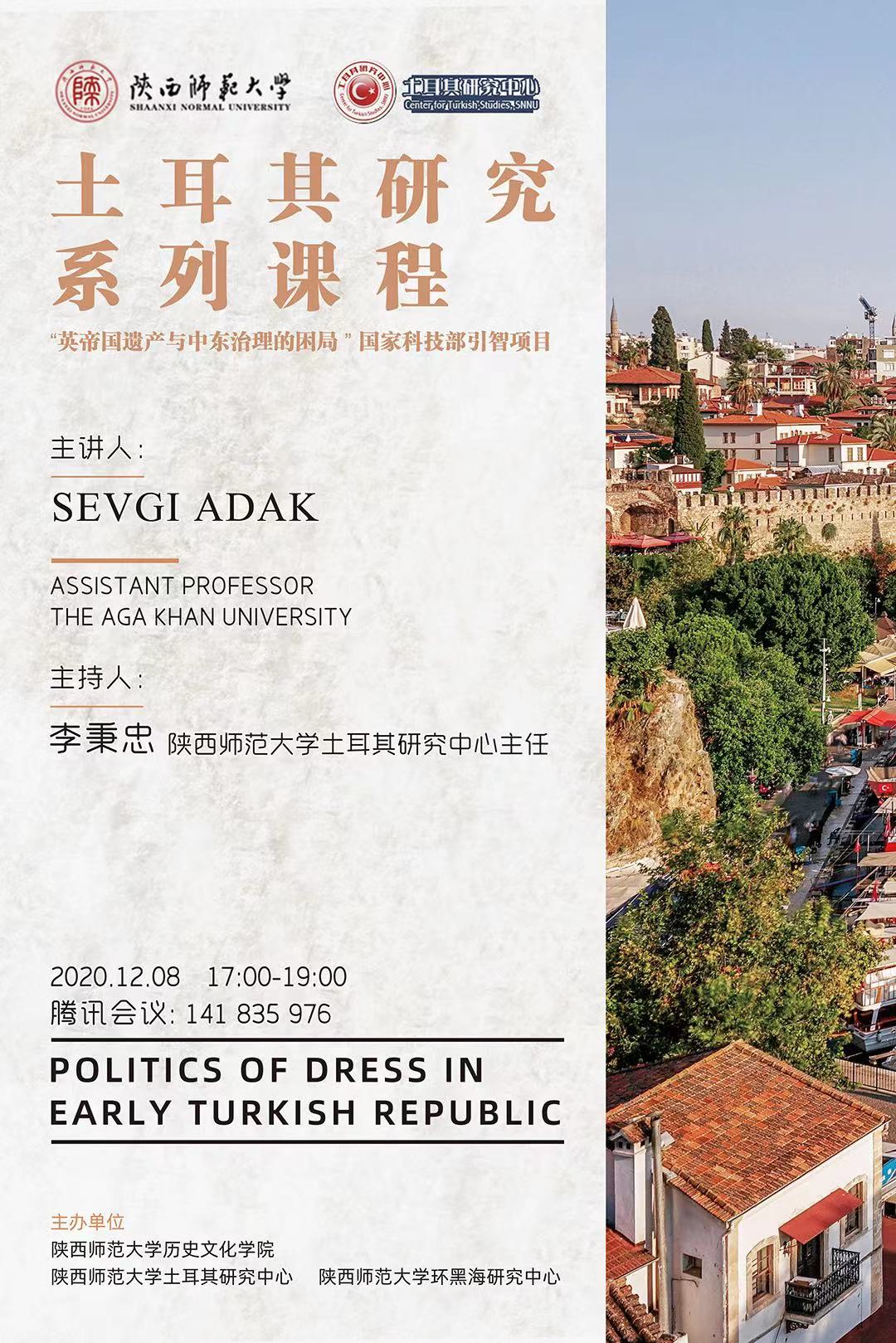 2020年12月8日下午5时,陕西师范大学历史文化学院、土耳其研究中心和环黑海研究中心主办的国家科技部引智项目“英帝国遗产与中东治理的困局”——土耳其研究系列课程第四讲顺利开课。本次课程的主讲人为阿加汗大学的塞吉·阿达克(Sevgi Adak)助理教授,主讲题目为“土耳其共和国早期的服饰政治(Politics of Dress in Early Turkish Republic)”。本次线上直播课由中心主任李秉忠教授和中心专职研究员尼克斯·克里斯托菲斯(Nikos Christofis)副教授主持,历史文化学院相关专业本科生、研究生,国内相关研究方向学者共同参加。