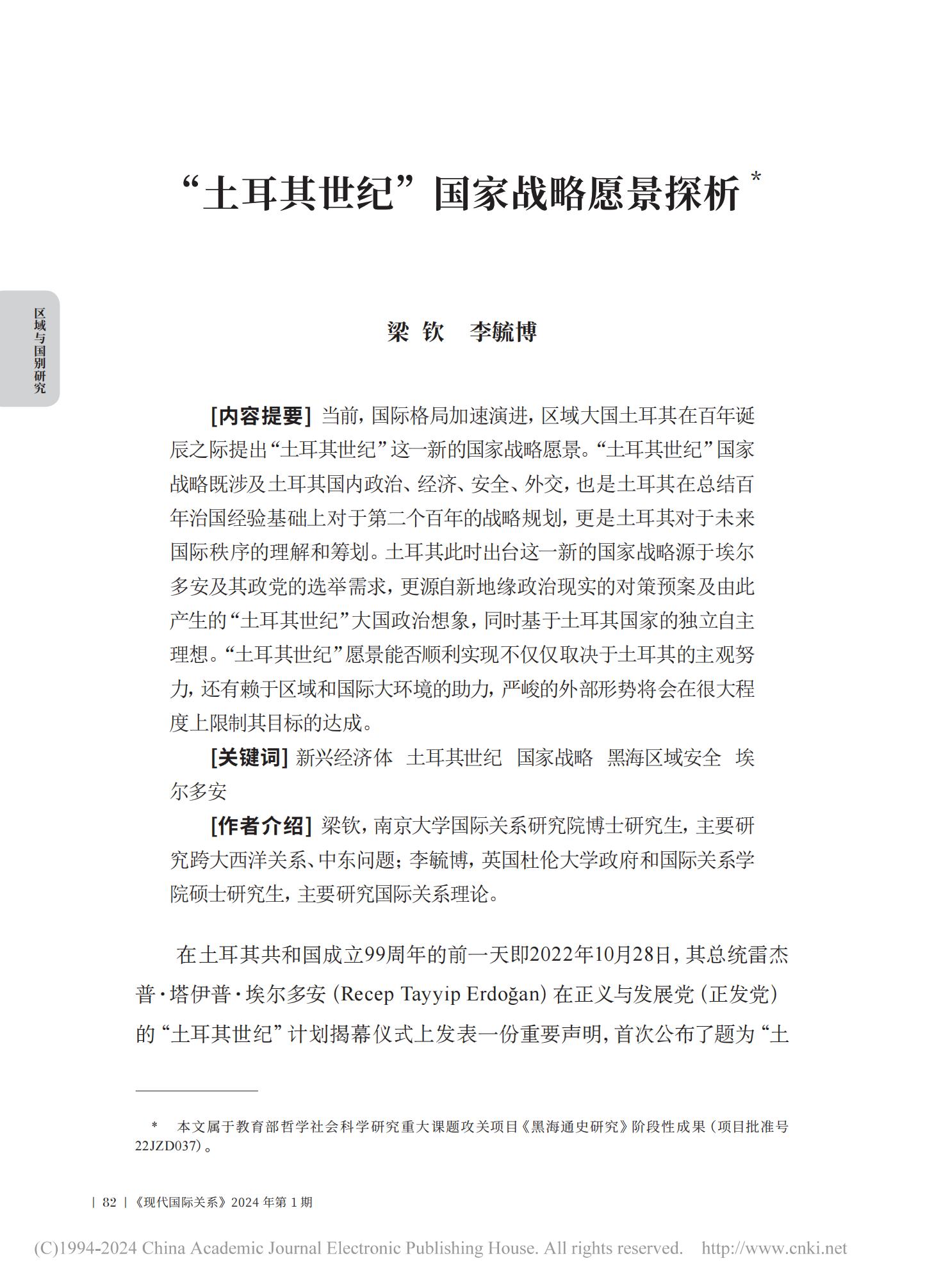 中心成员、“黑海通史研究”项目组成员梁钦、李毓博在《现代国际关系》2024年第1期上发表《“土耳其世纪”国家战略愿景探析》一文,全文如下: