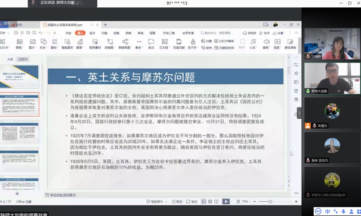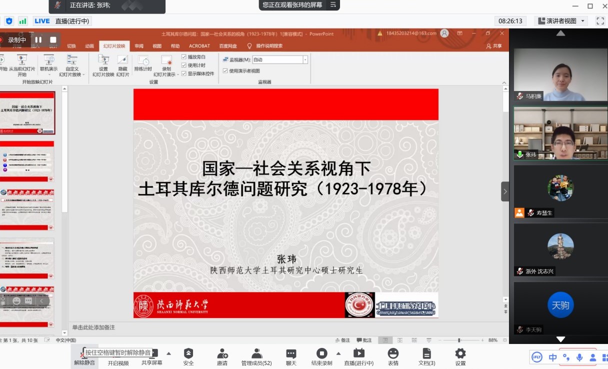 中心硕、博士研究生积极参与本次会议。2019级博士研究生寇梦卓作题为《土耳其向多党制转型:国际、国家与国民的视角》的报告。她从国际背景、国内因素以及农村政治生活三个角度阐释了土耳其向多党制的转型,其有必然因素,也有偶发因素;既有外在因素,也有内部因素,而凯末尔时期的世俗化改革的政治经济遗产使土耳其农村地区受到重视,结合民主政治内在的逻辑,一定程度上催生出农村政治的广泛参与。另一方面,民主党也使得农村融入了全国的政治舞台,积极促进个人参与政治,本身就是一场深刻的改革。