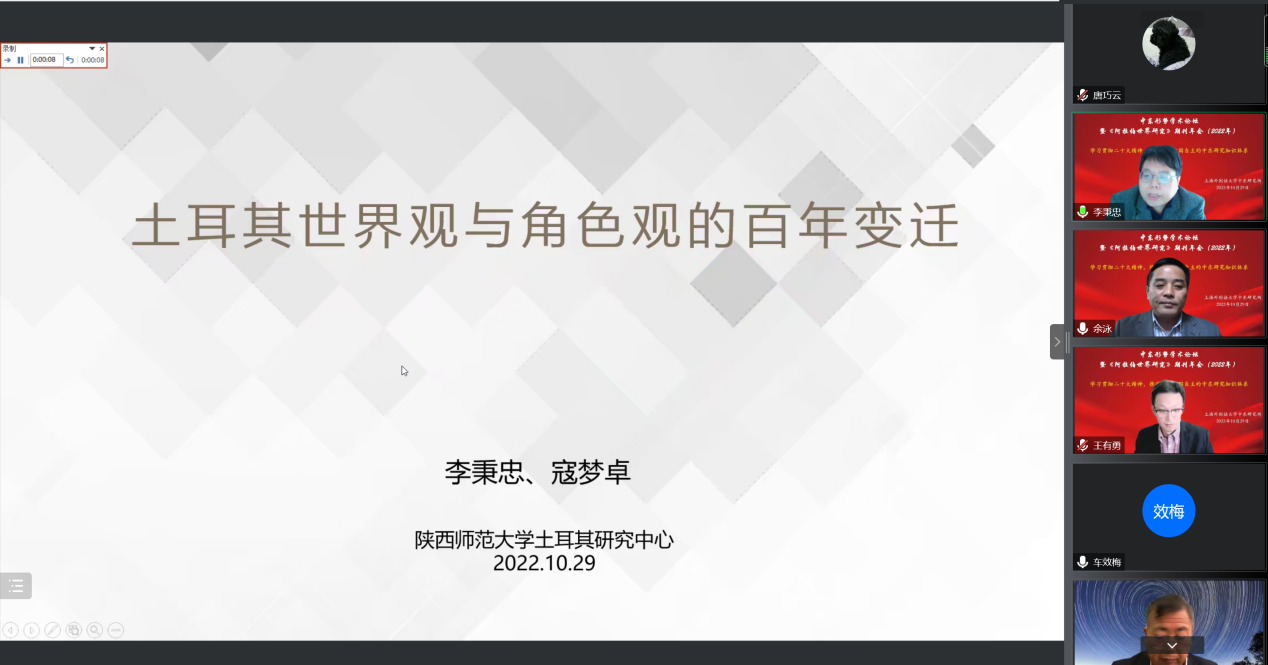 李秉忠教授在分论坛三“历史文明与构建中国中东研究知识体系”中作题为“土耳其世界观与角色观的百年变迁”的发言。该分论坛由上海外国语大学中东研究所副所长余泳副研究员主持,上海外国语大学中东研究所舒梦助理研究员评议。李秉忠教授将土耳其共和国建国至今的世界观和角色观的发展历程大致划分为四个阶段,梳理了这四个阶段土耳其对于世界认知的变化和延续,土耳其的世界观与角色观变化表现出很强的规律性与层次性。在审视土耳其世界观与角色观时应重视土耳其对文明的理解与自身历史的认知,以及这种世界观与角色观的变化同土耳其国内政治、社会变迁的关系。作为一个正在崛起的区域性大国,土耳其世界观和角色观的变迁反映出国家独立发展的合理化趋势,也是对世界历史和世界格局变迁的生动注解。