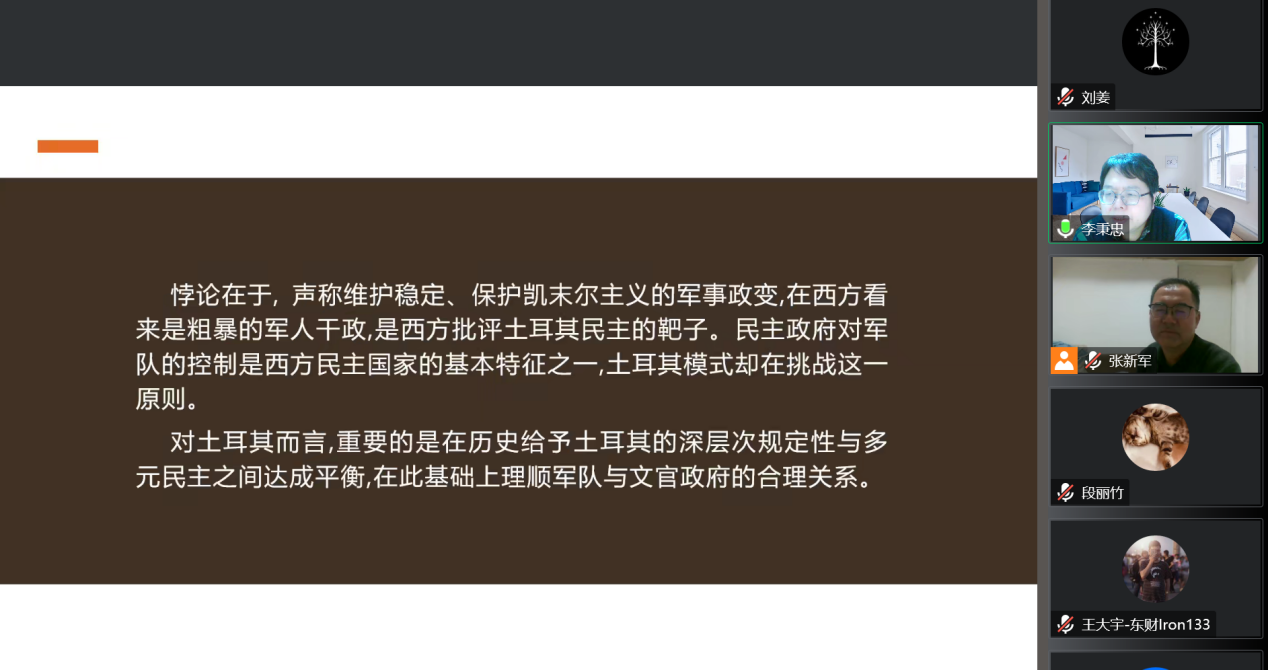 最后,李秉忠教授指出,土耳其军事政变过程中存在着许多悖论,如军方以维护世俗主义为旗帜,但未必完全维护世俗主义;一方面强调世俗主义的重要性,而一方面又强调选举政治的重要性,选举政治与世俗主义不无矛盾。目前,正发党政府对军事政变有着全新的阐释,这其中所包含的政治意蕴、土耳其民众认知的变化和当前国际格局的深刻变化对土耳其军政关系的影响等,这些问题都值得我们进行深入研究。