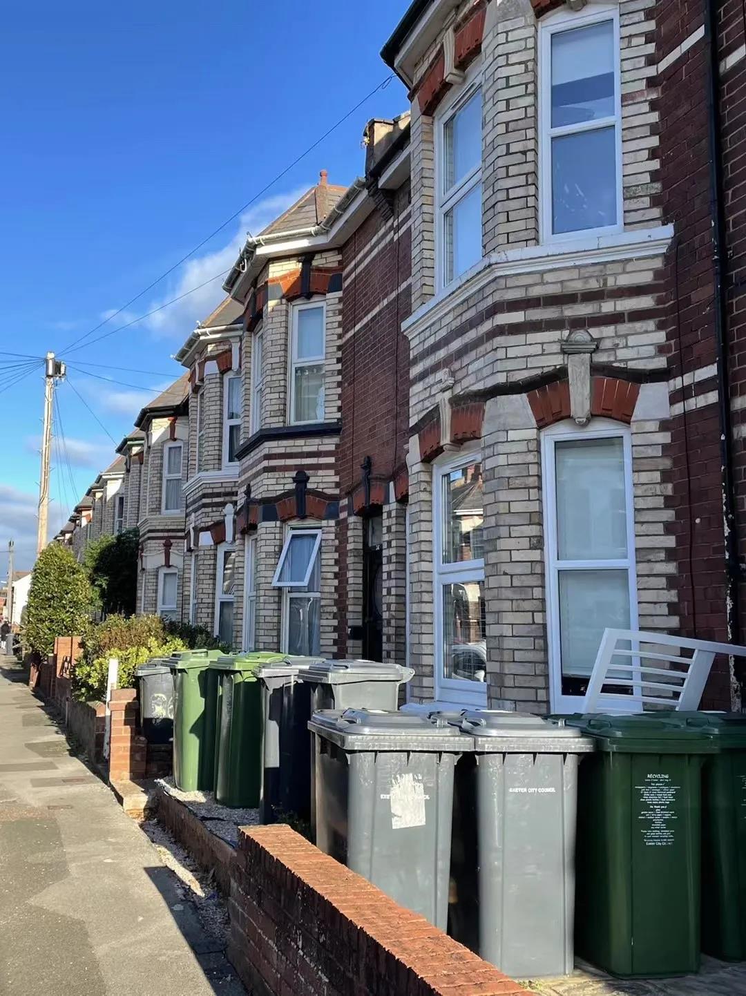 刚来这边,同住的一个小哥告诉我们这边扔垃圾很不方便,生活垃圾和可回收垃圾要分开,一周收生活垃圾,第二周收可回收垃圾,需要分别将装生活垃圾的黑色垃圾桶和装可回收垃圾的绿色垃圾桶放在门外等着专门人员上门来收,而且这项服务是要收费的。也就是说每种垃圾每隔两周才会有人来收走,而且就算垃圾桶满了,放在桶外面的垃圾也不会收走,只收放在桶内的垃圾。上周三亲自经历了收垃圾一事,因为房间内有人回国,留下许多垃圾,桶里根本放不下,只能用箱子装好放在黑色垃圾桶旁边,小哥说,只能祈求收垃圾的人收走,不然真的没办法处理。周三一大早我们就看到了整条街门口全是黑色垃圾桶的“壮景”,到了周三下午,我们的垃圾还是没有被收走,心里不禁有些嘀咕,直到周四早上,惊喜地发现门口的垃圾都被收走了,包括那两个大纸箱,我们才暗自高兴。不禁想到曾经在伦敦的宿舍里,只是将生活垃圾和可回收垃圾分类,也从来没有了解过英国的垃圾回收这么不方便,冬天还好,夏天温度高,这些生活垃圾经历两周高温的肆虐发出的味道多少会影响人的身心健康。在这种极不便利的垃圾回收模式下竟也没有发生一些流行疾病,又不得不感叹英国发达的垃圾处理系统。于此,我们才了解到为何英国各家各户门口都有很多垃圾桶。师门B曾经开玩笑说:“有这么多垃圾桶的都是大户人家”。