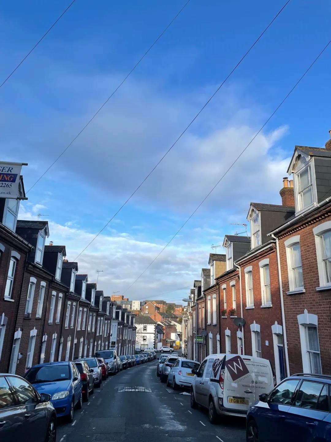 除了day2和day8投递核酸包我们基本上严格遵守隔离规定不出门。好不容易出门有了放风的机会,才发现这座城市真小,市中心基本只有一条街,从东走到西,但是该有的商店也基本较全。和伦敦最大的不同就是安静,除了市中心,人很少,天际线很低,房屋很低,空气很好,天很蓝。我们门口是一个长陡坡,我很喜欢站到马路中间拍照,低矮的房屋和路边的汽车,映衬着这座城市的烟火气。英国曾被留学生戏称为“除了伦敦都是村”,某app上的埃克塞特大学的留学生戏称埃克塞特为“埃村”。但相比于伦敦的繁华,我更喜欢埃克塞特这座小城的安逸和舒适。